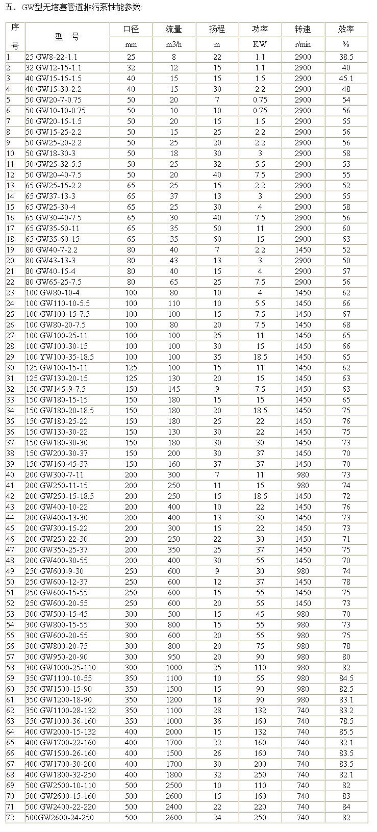 GW型無堵塞管道排污泵一、產品概述 二、產品特點 1、泵與電機直聯同軸,屬機電一體化產品,結構緊湊,性能穩定。 2、大流道抗堵塞水力部件設計,大大提高污物通過能力,能有效通過泵口徑的5倍纖維物質和直徑為泵口徑約50%的固體顆粒。 3、設計合理,配套電機合理,效率高,噪音低,節能效果顯著。 4、機械密封采用硬質耐磨碳化鎢,具有耐用、耐磨等特點,可以使泵安全連續運行8000小時以上。 5、泵為立式結構,進出口中心線在同一水平線上,且進出口法蘭規格相同,安裝拆卸十分方便。 6、占地面積小,無需建機房,可節省大量基建費用;在電機風葉端加上防護罩,整機可置于室外工作。 三、主要用途: 適用于化工、石油、制藥、采礦、造紙工業、水泥廠、煉鋼廠、電廠、煤加工工業,以及城市污水處理廠排水系統、市政工程、建筑工地等行業輸送帶顆粒的污水、污物,也司用于抽送清水及帶腐蝕性介質。 |
