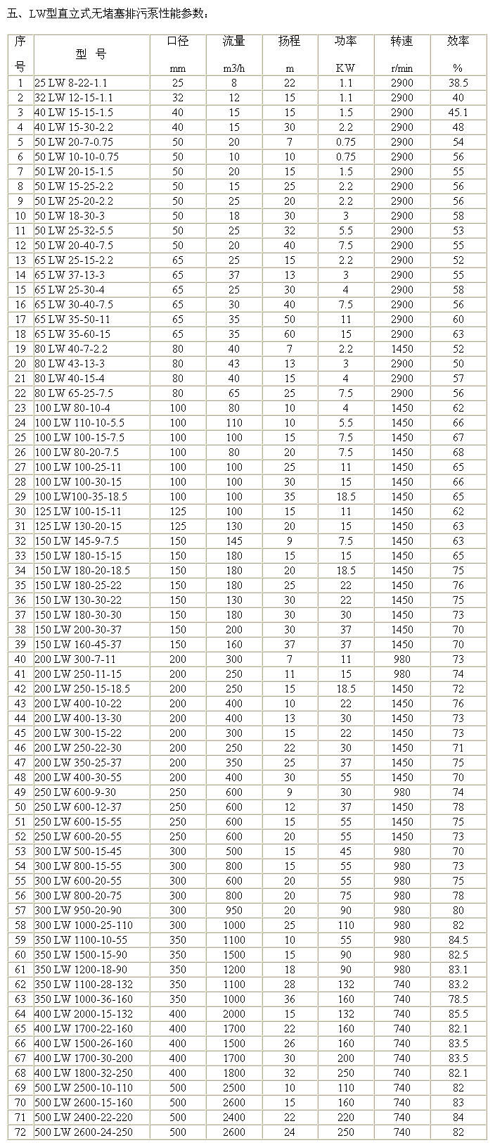 LW型直立式無堵塞排污泵一、產品概述: LW型直立式無堵塞排污泵是在引進國外 技術的基礎上,結合國內水泵的使用特點而研制成功的新一代泵類產品,具有節能效果顯著、防纏繞、無堵塞、自動安裝和自動控制等特點。在排送固體顆粒和長纖維垃圾方面,具有獨特效果。 二、產品特點: 1.采用獨特的單片或雙葉片葉輪結構,大大提高了污物通過能力,能有效的通過泵口徑的5倍纖維物質與直徑為泵口徑約50%的固體顆粒。 2。機械密封采用 硬質耐腐的鈦化鎢材料,可使泵安全連續運行8000小時以上。 3.整體結構緊湊、體積小、噪聲小、節能效果顯著,檢修方便,無需建泵房,潛入水中即可工作,大大減少工程造價。 三、主要用途: 適用于化工、石油、制藥、采礦、造紙工業、水泥廠、煉鋼廠、電廠、煤加工工業,以及城市污水處理廠排水系統、市政工程、建筑工地等行業輸送帶顆粒的污水、污物,也司用于抽送清水及帶腐蝕性介質。 四、型號意義: