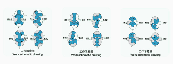 一、產品概述: 轉子泵又稱膠體泵,三葉泵,鞋底泵等。依靠兩同步反向轉動的轉子(齒數為2-4)在旋轉過程中于進口處產生吸力(真空度),從而吸入所要輸送的物料。兩轉子將轉子室分隔成幾個小空間,并按a→b→c→d的次序運轉。運轉至位置a時,只有I室中充滿介質; 到位置b時,B室中封閉了部分介質; 到位置c時,A室中也封閉了介質; 到位置d時,A、B室與Ⅱ室相通,介質即被輸送至出料口。如此循環往復,介質(物料)即被源源不斷地輸送出。