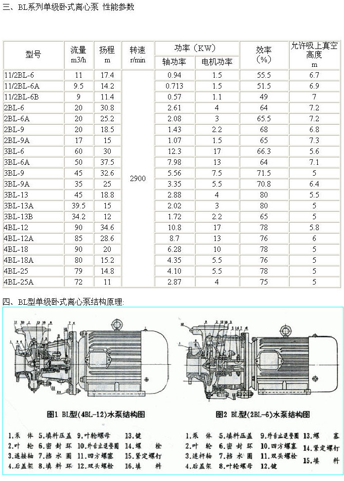 BL型單級臥式離心泵一、產品概述: BL型泵系單級單吸懸臂式直連離心清水泵,此型泵是根據BA型泵基礎上對結構改進,具有外形小、重量輕、結構簡單、安裝方便等特點,可供輸送清水及物理化學性質類似于水的液體之用。 二、型號說明: