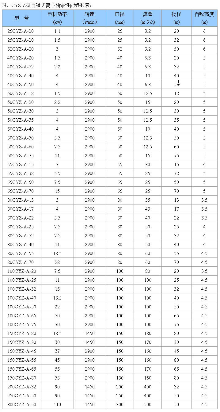 CYZ-A型自吸式離心油泵![]() CYZ-A型自吸式離心油泵 更多信息一、產(chǎn)品概述: CYZ-A型自吸式離心油泵是根據(jù)國(guó)內(nèi)外有關(guān)技術(shù)資料經(jīng)消化、吸收、改進(jìn)后研制而成的最新泵類產(chǎn)品,該泵適用于石油行業(yè)、陸地油庫、油罐車的理想產(chǎn)品,并適合于作船用貨油泵、艙底泵、消防泵和壓載泵及機(jī)器冷卻水循環(huán)等,分別輸送汽油、煤油、柴油、航煤等石油產(chǎn)品和海水、清水,介質(zhì)溫度 二、產(chǎn)品特點(diǎn): 1、該泵屬自吸式離心泵,它具有結(jié)構(gòu)簡(jiǎn)單、操作方便、運(yùn)行平穩(wěn)、維護(hù)容易、效率高、壽命長(zhǎng),具有較強(qiáng)的自吸能力等優(yōu)點(diǎn)。管路中不需底閥,工作前只需保證泵體內(nèi)儲(chǔ)有定量引油即可。用于油輪或輸水船舶上時(shí),可兼作掃艙泵,掃艙效果良好, 2、該泵是選用 材料精制而成,密封采用硬質(zhì)合金機(jī)械密封,經(jīng)久耐用,吐出管路不需要安裝安全閥,吸入管路不需安裝底閥,因此簡(jiǎn)化了管路系統(tǒng),又改善了勞動(dòng)條件。 三、型號(hào)意義:
