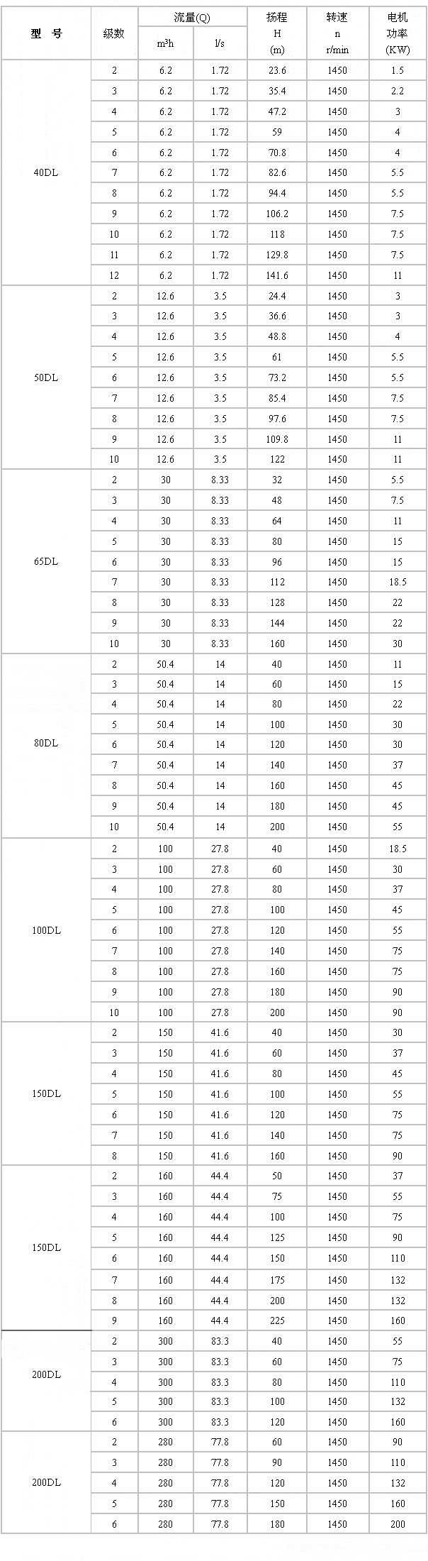 流量:4.2 揚程:24 功率:1.5-450kw; 轉速:1480r/min; 口徑:φ40-φ250; 溫度范圍:0-+ 工作壓力:≤2.4Mpa。 五、型號意義: 150 – 泵進出口直徑(mm) DL – 立式多級離心泵 R – 熱水型 150 – 泵設計流量(m3/h) 30 – 泵設計點單級揚程(m3/h) 3 – 級數 六、DL立式多級離心泵性能參數: