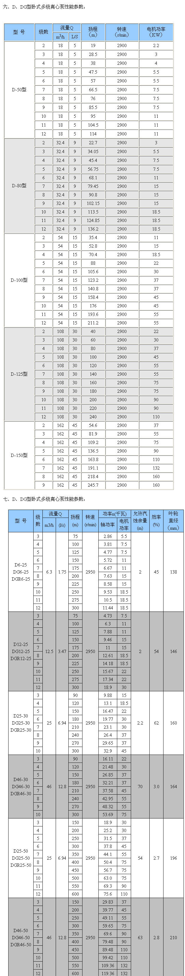 D、DG型臥式多級離心泵![]() D、DG型臥式多級離心泵 更多信息一、產品概述: D、DG型泵系臥式、單吸多級、分段式離心泵。 供輸送清水或物理化學性質類似于水的其它液體。也可以通過改變泵過流部件材質、密封形式和增加冷卻系統用于輸送熱水、油類、腐蝕性或含磨粒的介質。產品執行JB/T1051-93《多級清水離心泵型式與基本參數》標準。 二、適用范圍: 適用于工業和城市給排水、高層建筑增壓供水,園林噴灌、消防增壓、遠距離送水、采暖、浴室等冷暖水循環增壓及設備配套等,尤其適用于小型鍋爐給水。 三、產品特點: 1、水力模型 , 2、泵運行平穩,噪音低。 3、軸封采用軟填料密封或機械密封,密封 、結構簡單,維修方便快捷。 4、軸為全封結構,確保了不與介質接觸,不銹蝕,使用壽命長。 四、技術參數: 流量:6.3 揚程:13 功率:2.2-400KW; 轉速:1450-2950r/min; 口徑:φ50-φ200; 溫度范圍:≤ 工作壓力:≤3.0Mpa。 五、型號意義: D(DG) 46 - 50×12 D(DG)– 分段式鍋爐給水離心泵 46 – 設計流量(m3/h) 50 – 單級揚程(m) 12 – 級數 |