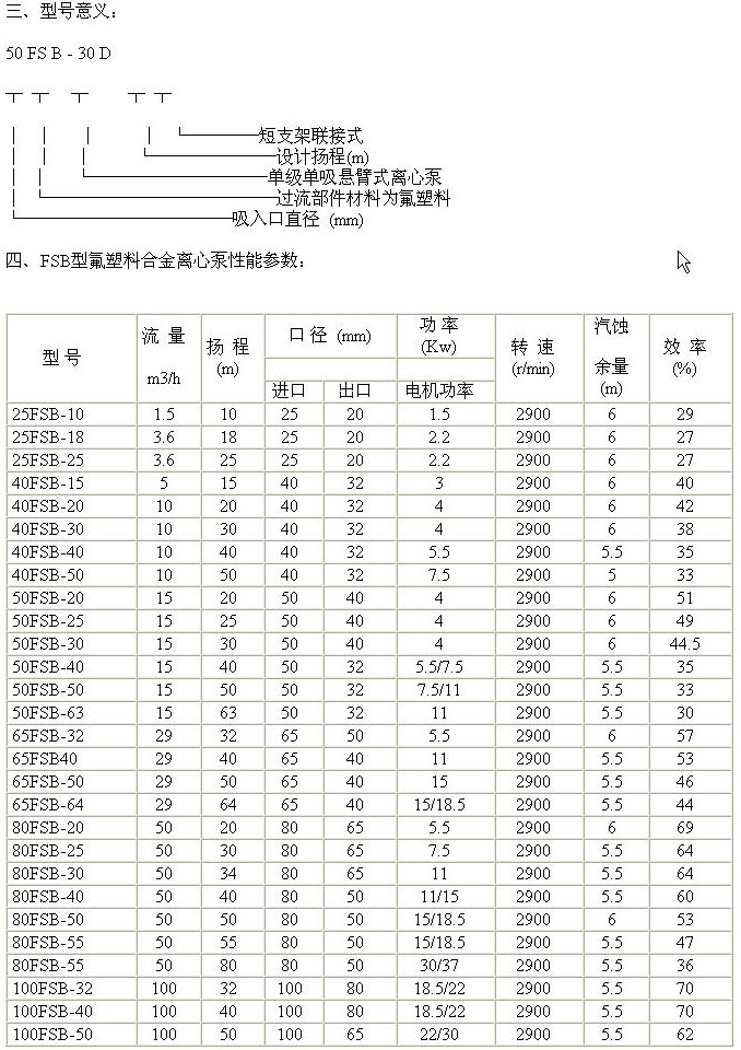 FSB型氟塑料合金離心泵![]() FSB型氟塑料合金離心泵 更多信息一、產品概述: FSB型氟塑料合金離心泵按國際標準設計,泵體采用金屬外殼內襯聚全氟乙丙烯(F46), 泵蓋、葉輪和軸套均用金屬嵌件外包氟塑料整體燒結壓制成型,軸封采用外裝式波紋管機械密封,靜環選用99%氧化鋁陶瓷或氮化硅,動環采用四氟填充材料,耐腐耐磨,適用于輸送任何濃度的硫酸、鹽酸、醋酸、氫氟酸、硝酸、王水、強堿、強氧化劑、有機溶劑、還原劑等苛刻條件的強腐蝕性介質,是目前世界上最強耐腐蝕裝備之一。其具有結構緊湊合理、耐強腐蝕、密封性能嚴密可靠、工作穩定、噪聲低、機械強度高、不老化、無毒素分解、維修方便、流道光滑、效率高,節約能源等優點。杜絕跑、冒、滴、漏, 應用于化工、制酸、制堿、冶煉、稀土、農藥、染料、醫藥、造紙、電鍍、電解、酸洗、無線電、化成箔、科研機構、國防工業等行業。 二、技術參數: 流量:3.6~100m3/h; 揚程:15~55m; 轉速:2900r/min; 功率:1.5~18.5KW; 進口直徑:25~100mm; 適用溫度:-20℃~ |