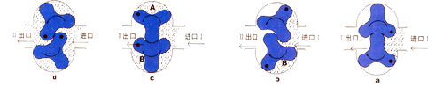 LQ系列膠體泵-又稱羅茨泵、不銹鋼轉(zhuǎn)子泵、凸輪泵、萬用輸送泵、酵母泵、蝴蝶泵、三葉泵、鞋底泵、藥料泵、熱溶膠體泵、顆粒膠體泵、渣料泵、蛋白渣泵、高濃漿泵等,依靠兩個同步反轉(zhuǎn)動的轉(zhuǎn)子在旋轉(zhuǎn)過程中于進口處產(chǎn)生吸力(真空度),從而吸入所要輸送的物料。兩轉(zhuǎn)子將轉(zhuǎn)子室分隔幾個小空間,并按a b c d 的次序運轉(zhuǎn);運轉(zhuǎn)至位置a 時,只有 I 室中充滿介質(zhì);到位置 b 時,B室中封閉了部分介質(zhì);到位置c 時,A 室中也封閉了部分介質(zhì);到位置 d 時,A、B 室與 II 室相通,介質(zhì)既被輸送至出料口。