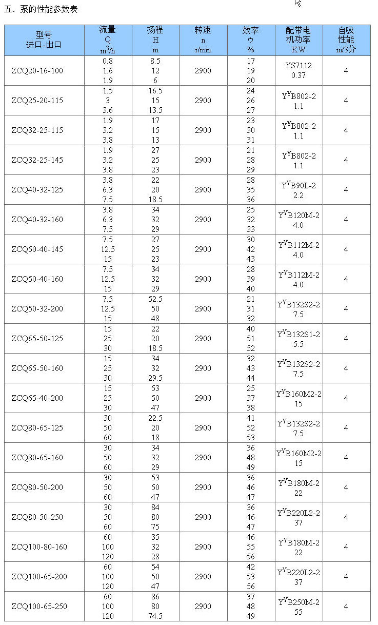 本泵采用外混式軸向水泵結構,泵體由吸液室、儲液室、蝸殼、回流孔、氣液分離室等部件組成。泵啟動后,在離心力的作用下,吸水室中的剩余液與進液管路中的空氣被葉輪攪拌成氣水混合物,混合物經蝸殼進入氣液分離室,隨著速度減慢,導致氣水分離,空氣由泵出液口排出,液經回水孔返回泵內,經過多次循環(huán),進液管道中的空氣被排凈,使泵內形成一定的真空度,達到自吸作用。 三、泵的主要性能參數(shù):