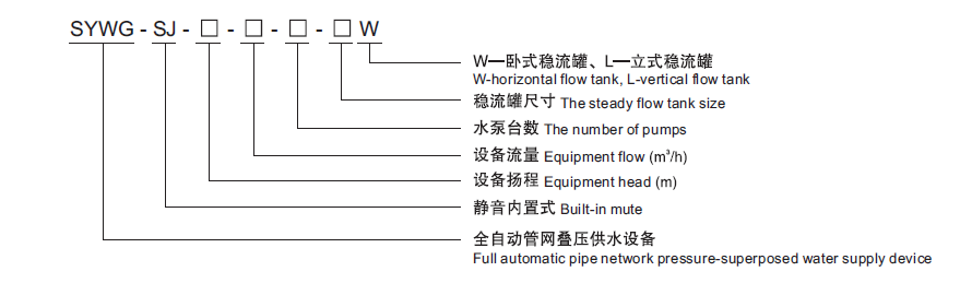 SYWG-SJ內置水泵管網疊壓供水設備,由不銹鋼潛水泵(一般一臺至2臺),穩流罐1個,罐上設有壓力傳感器、真空抑制器,不銹鋼止回閥、不銹鋼蝶閥(或球閥)、氣壓穩壓罐、不銹鋼管路、變頻控制柜。