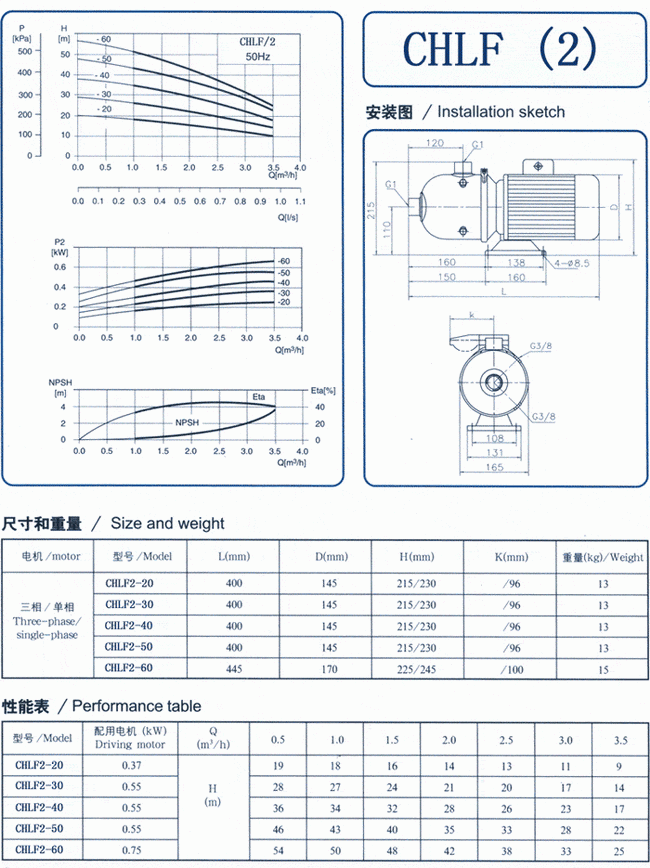 CHLF輕型不銹鋼多級離心泵性能參數表
