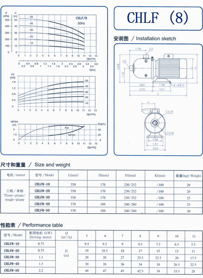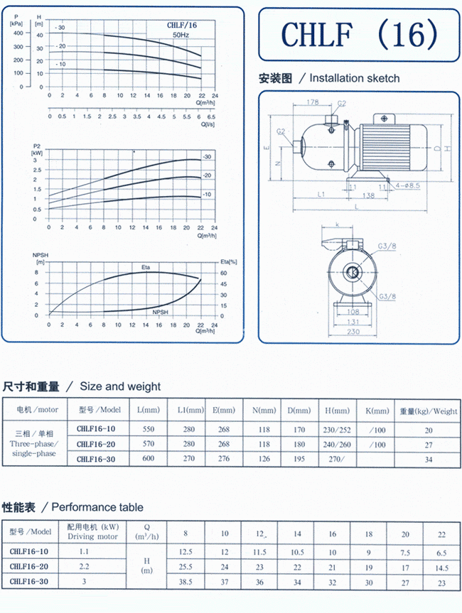 導航:回首頁---當前位置---水泵產品內容頁補充頁 >> CHLF輕型不銹鋼多級離心泵性能參數表