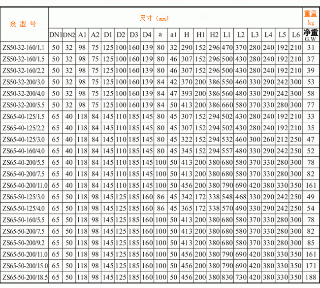 ![]() ZS型不銹鋼臥式單級離心泵尺寸表