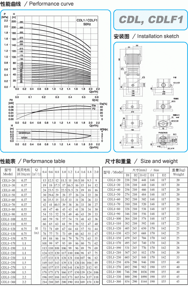 導航:回首頁---當前位置---水泵產品內容頁補充頁 >> CDLF系列輕型不銹鋼立式多級泵性能參數表(1) |