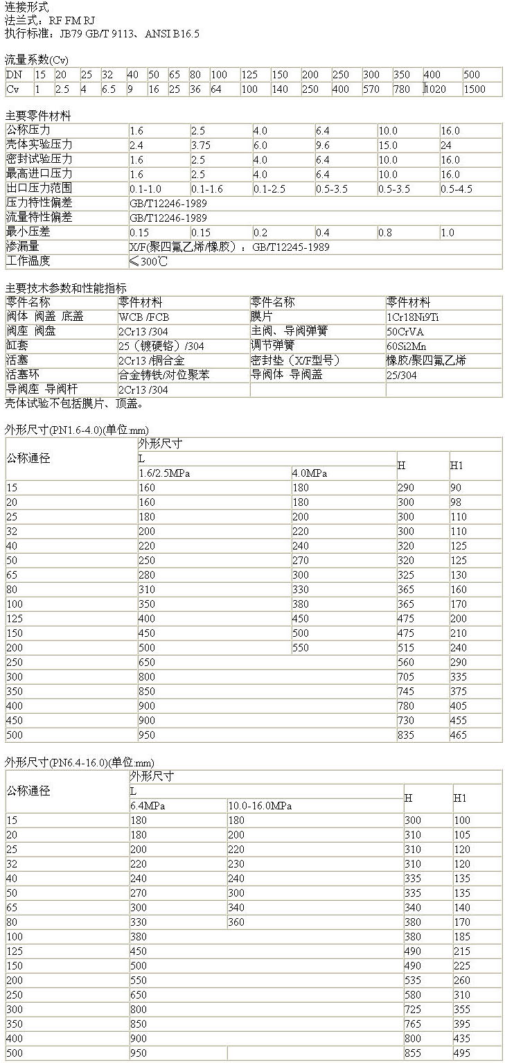 結構特點及用途 本系列減壓閥屬于先導活塞式減壓閥。由主閥和導閥兩部分組成。主閥主要由閥座、主閥盤、活塞、缸套、彈簧等零件組成。導閥主要由閥座、閥瓣、膜片、彈簧、調節彈簧等零件組成。通過調節彈簧壓力設定出口壓力,利用膜片傳感出口壓力變化,通過導閥啟閉驅動活塞調節主閥節流部位過流面積的大小,實現減壓穩壓功能。 本產品主要用于氣體管路,如空氣、氮氣、氧氣、氫氣、液化氣、天然氣等氣體。 訂貨須知 產品型號 公稱壓力 公稱通徑 鏈接法蘭標準 進口壓力 額定流量 系數Cv 調節范圍 工作介質和介質溫度 | |